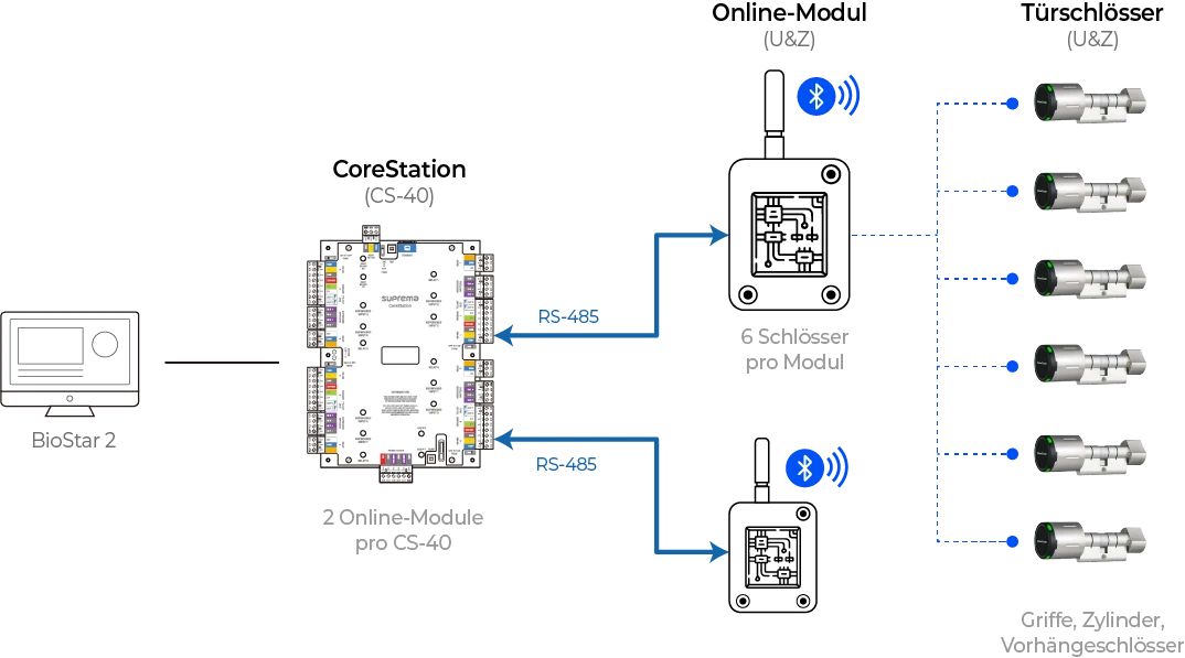 Die kabellosen Schlösser von Suprema bieten eine unternehmensweite, flexible Zugangskontrolle, die nahtlos mit BioStar 2 verbunden ist. Ob Sie OSDP, eigenständige Smart-Reader oder Wiegand-Sensoren verwenden, jede Konfiguration verbindet das Online-Modul von U&Z mit Suprema-Geräten für drahtlose Bluetooth-Kommunikation, Echtzeitdaten und verschlüsselte sichere Authentifizierung.