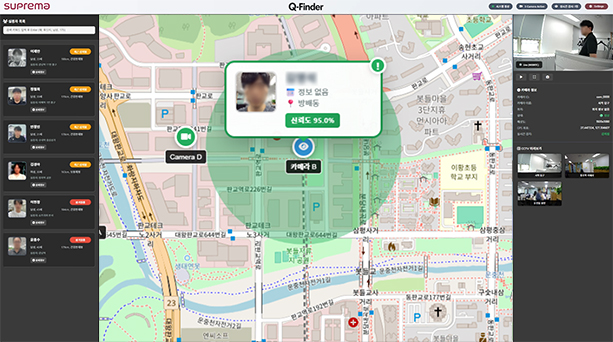 이 흐름 속에서 슈프리마의 ‘수색자 검색 솔루션(Q-Finder)’은 이미 설치된 CCTV 인프라에 AI를 더해, 도시 전체의 수색 상황을 하나의 의사결정 화면으로 전환하는 플랫폼이다. 국산 최초 AI 안면인식 기반 수색자 검색 시스템으로, 경찰·지자체가 보유한 CCTV 네트워크에 슈프리마의 독자 AI 얼굴인증·영상분석 알고리즘을 연결해 실종자·용의자 등 수색자를 실시간으로 탐색한다.